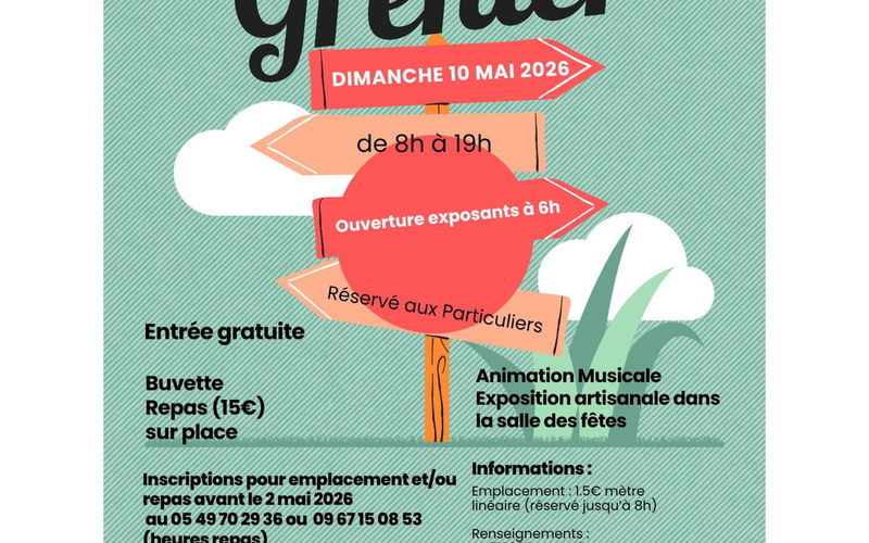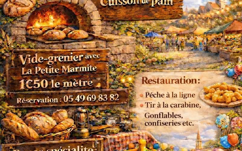 Vide grenier : à partir de 6h30 dans la rue principale, réservation emplacement au restaurant la PETITE MARMITE 05.49.69.83.82 1.50€ le mètre.