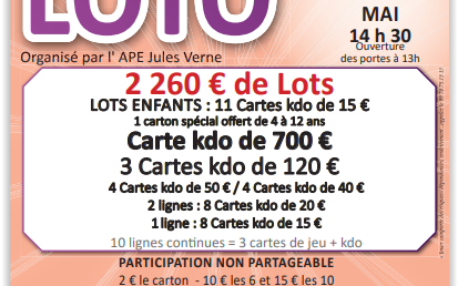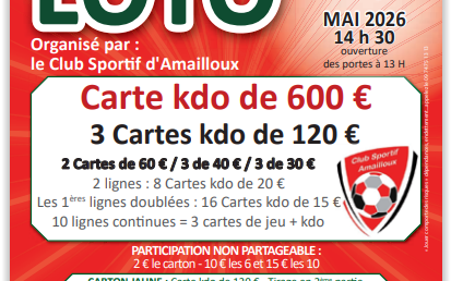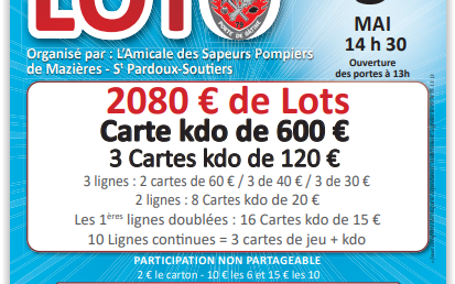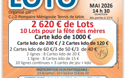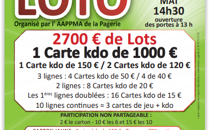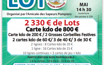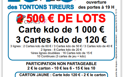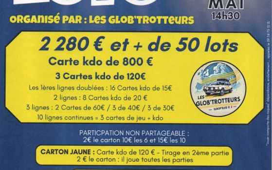 Organisé par l'Association Coul'jeu d'antan. Formule à 20€ 12 Cartons, 1 Bingo, 1 Spécial rose ( non Partageable) 2€ le carton 10€ les 6 cartons 15€ les 10 cartons bingo 2€ l'un 5€ les trois Partie spéciale rose 2€ l'une 5€ les trois Diagoloto 3€ l'un 5€ les deux. Diagoloto 2 achetés le troisième offert.