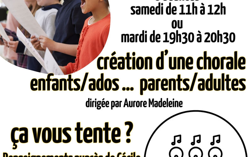 Vous avez envie de chanter ? Juste pour essayer ? C'est par ici ! Venez goûter aux plaisirs de chanter dans une chorale, sous la direction de Aurore Madeleine. Vous pouvez venir seul.e ou accompagné.e de vos enfants, petits enfants ou parents !