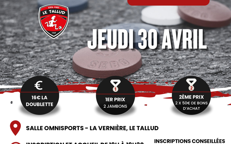 Inscription conseillée vie la QR Code sur l'affiche 16€ le binôme CHANGEMENT DE LIEU : Le Tallud - Salle omnisport accueil de 19h à 19h30 début du tournoi 19h45