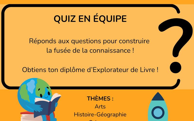 Dans le cadre de la manifestation La Science se Livre, la médiathèque met à l'honneur son espace documentaire jeunesse avec un grand quiz en équipe. Deviens un Explorateur du Livre confirmé en répondant à différentes questions qui te permettront d'assembler petit à petit la Fusée de la Connaissance. Comment faire ? Tout simplement en cherchant la réponse... dans les livres de la médiathèque ! Et à l'issue de l'animation, si tu as bien joué, un diplôme d'Explorateur du Livre te sera décerné pour récompenser tes compétences !