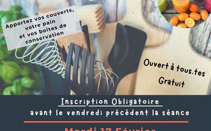 Le Centre Socio Culturel vous invite à participer à un atelier cuisine, qui se déroulera de 9 h 30 à 12 h 30, dans les cuisines du CCAS. Pour participer, il est nécessaire de s'inscrire avant le vendredi précédant chaque séance.