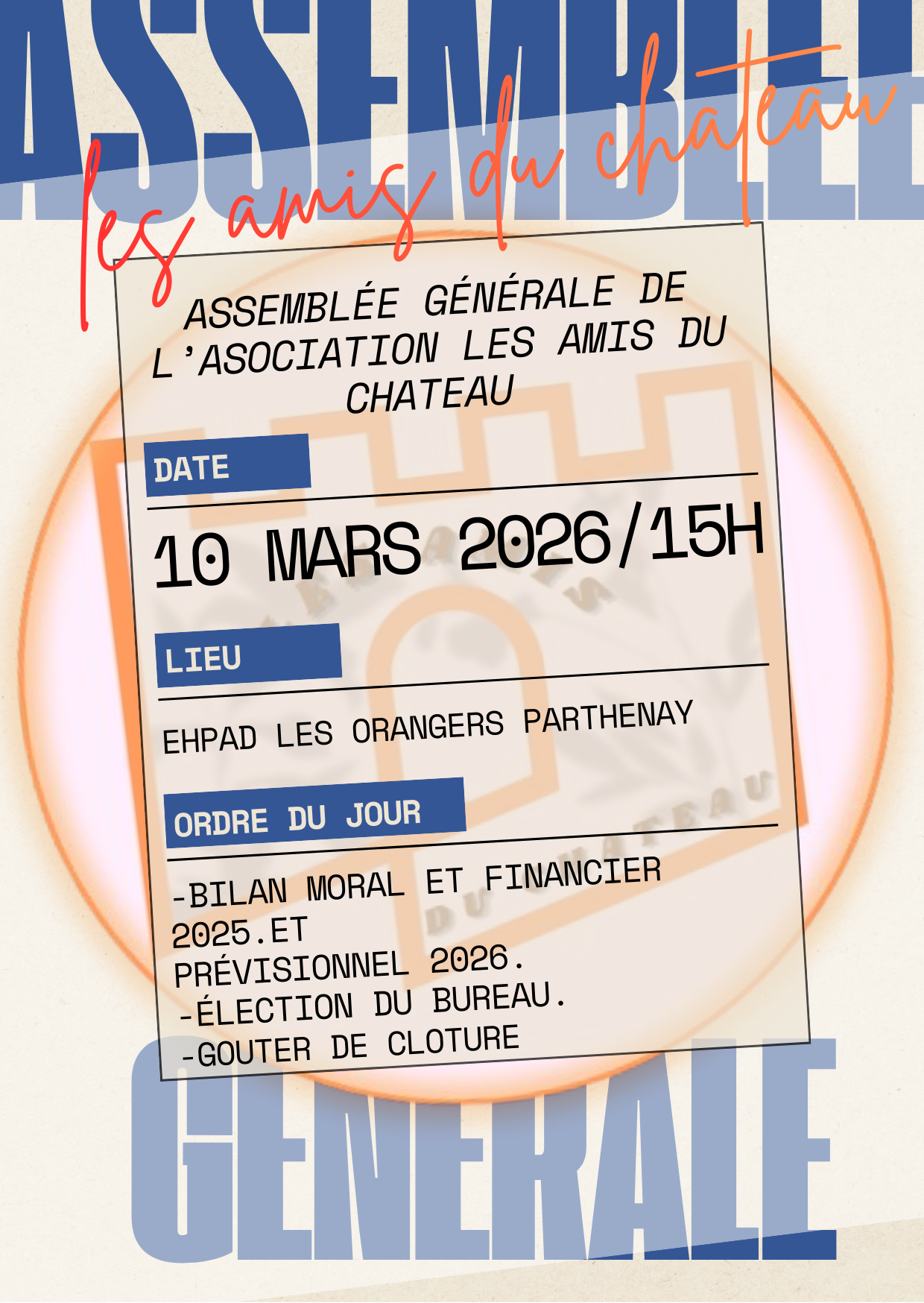 L'Association "les Amis du château organise son assemblée générale annuelle , le mardi 10 Mars à partir de 14h30, à l'EHPAD les Orangers : 23 rue Georges Turpin Parthenay. Venez découvrir notre activité et rejoindre l'équipe .