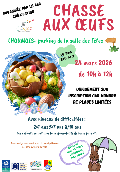Le CSC Créa'Gâtine organise une grande chasse aux œufs le 28 mars 2026, de 10h à 12h, à Lhoumois ! (RDV sur le parking de la salle des fêtes.)