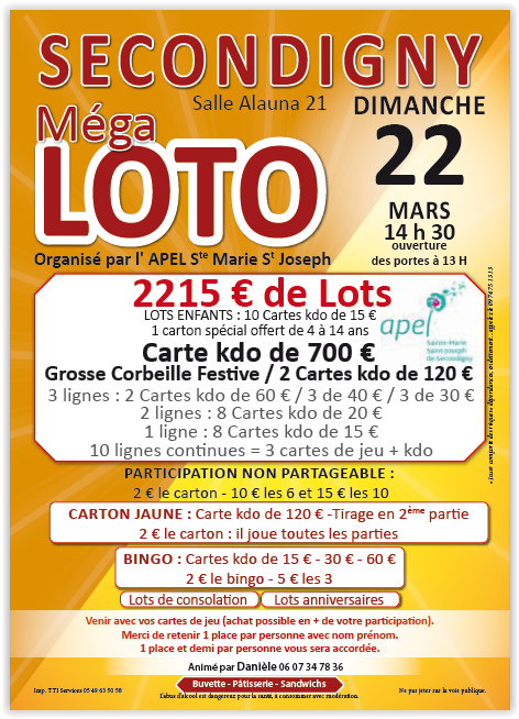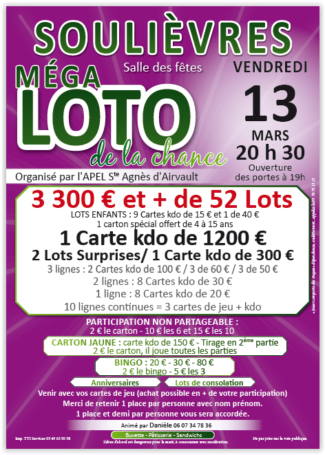 L’association VAUSSEROUX ANIMATION vous propose de se retrouver à la Salle des Fêtes de Vausseroux dès 19h30 avec de nombreux lots à gagner (1carte cadeau 200€ - 2 vols en ULM...)
