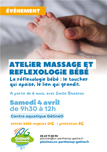 L'atelier massage et réflexologie c'est quoi ? Il s'agit d'une séance découverte de réflexologie bébé sur 20 minutes, à partir de 6 mois, la réflexologie pour bébé est une technique douce et non invasive qui vise à améliorer le bien-être des nourrissons. Elle favorise la communication avec le bébé, apaise le bébé, favorise le sommeil (il devient plus long, et l'endormissement plus facile), favorise le lien d'attachement et favorise la digestion (soulage les maux de ventre). Petit groupe de 10 bébés maximum à partir de 6 mois, sur réservation uniquement. Maillot de bain obligatoire.