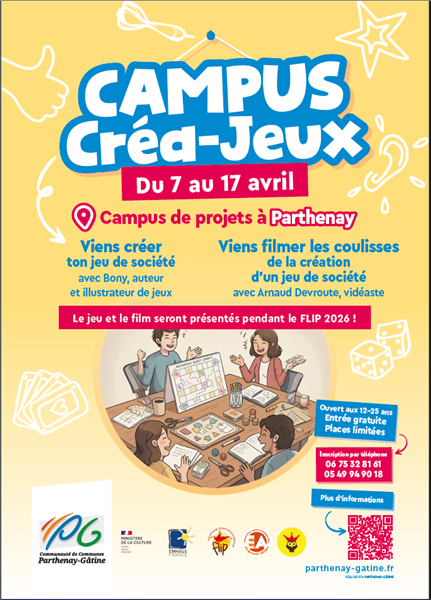 Participez au premier "Campus Créa'jeux" : un projet créatif et collectif de 2 semaines animés par des professionnels pour créer un jeu ou filmer les coulisses de création ouvert aux jeunes de 12 à 25 ans. Les participants de l'ateliers vont imaginer, tester et créer un jeu avec l’aide de David Boniffacy et vont réaliser une vidéo sur les coulisses de la création d'un jeu sous forme de making-of et d'interviews avec l’aide de Arnaud Devroute. La participation implique engagement de deux semaines pour suivre le processus de création. Le jeu et le film créés seront officiellement présentés au Festival Ludique International de Parthenay (FLIP) en juillet 2026. Il y a 24 places disponibles, réparties entre les deux ateliers : 18 places pour le groupe “création de jeux de société”, 6 places pour le groupe “création vidéo”. L’inscription est obligatoire par téléphone.