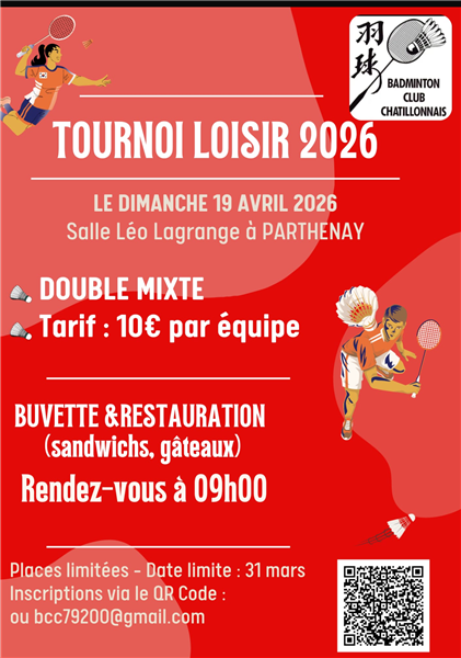 1er tournoi de badminton en loisir organisé par le club de Châtillon-sur-Thouet. Tableau unique bouble mixte Places limitées - date limite pour l'inscription : 31 mars
