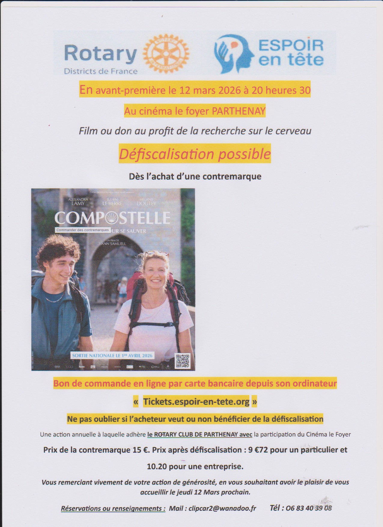 UNE AVANT-PREMIERE DU FILM « COMPOSTELLE » A PARTHENAY Le film « COMPOSTELLE » réalisé par Yann SAMUELL avec comme acteurs : Alexandra LAMY, Julien LE BERNE et Mélanie DOUTEY fera l’objet d’une avant-première : Le JEUDI 12 MARS au cinéma LE FOYER de Parthenay.1 seule séance à 20h30. Une projection en partenariat avec le ROTARY CLUB de PARTHENAY GÂTINE, dans le cadre de l’opération « ESPOIR EN TÊTE » qui récolte des fonds pour la recherche sur les maladies du cerveau. Le film qui avait été tourné en mai 2025, sortira en salle le 1er Avril. C’est une adaptation du livre : » Marche et invente ta vie » de Bernard OLIVIER. Crédit photo : FB Alexandra Lamy-Wonders films