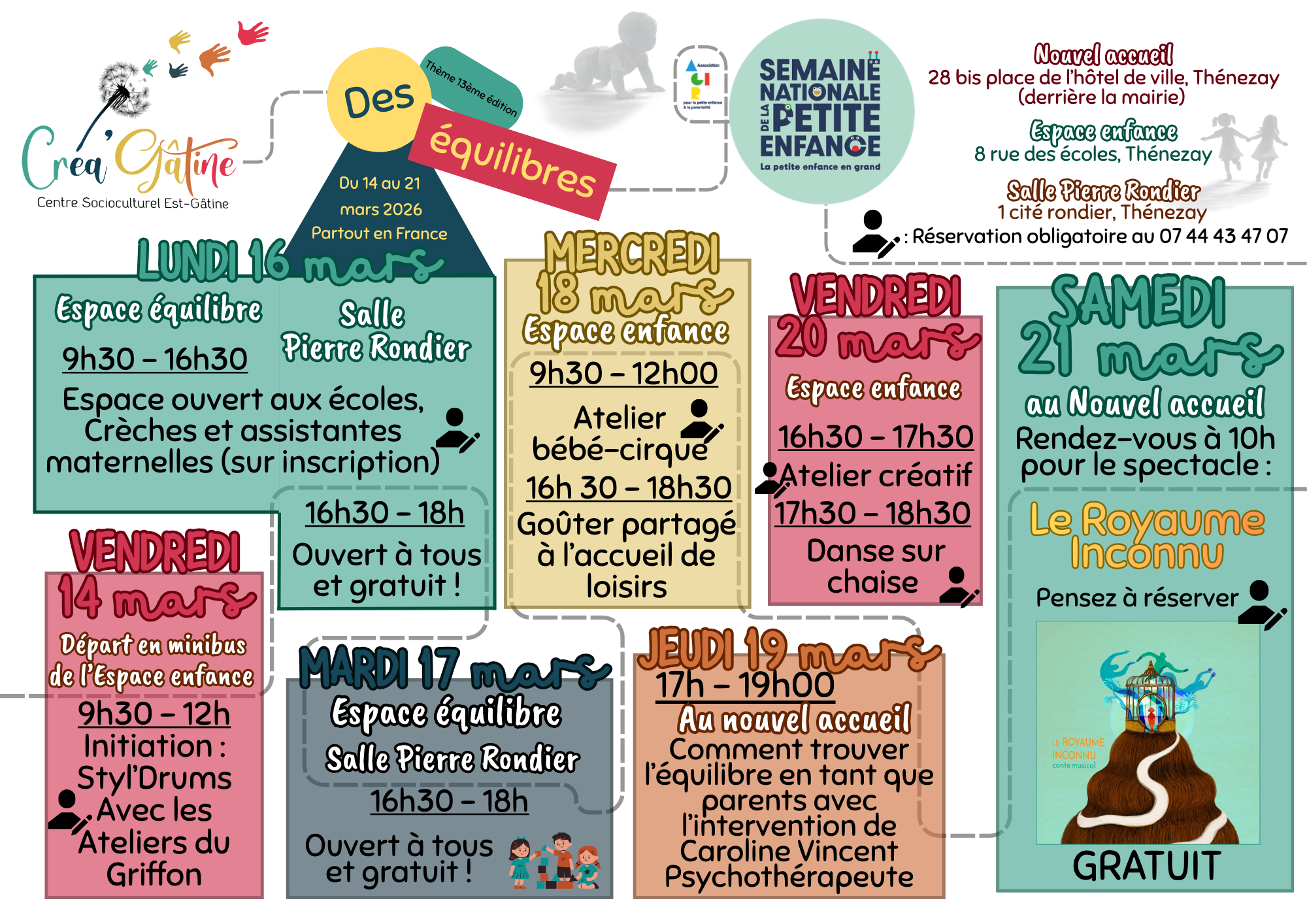 Toutes les animations proposées sont gratuites. Pour plus d’informations ou pour vous inscrire à un atelier, contactez Créa’Gâtine au 07 44 43 47 07. Retrouvez le flyer sur notre site internet : https://creagatine.jimdofree.com/