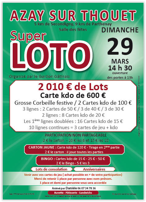 L’association VAUSSEROUX ANIMATION vous propose de se retrouver à la Salle des Fêtes de Vausseroux dès 19h30 avec de nombreux lots à gagner (1carte cadeau 200€ - 2 vols en ULM...)